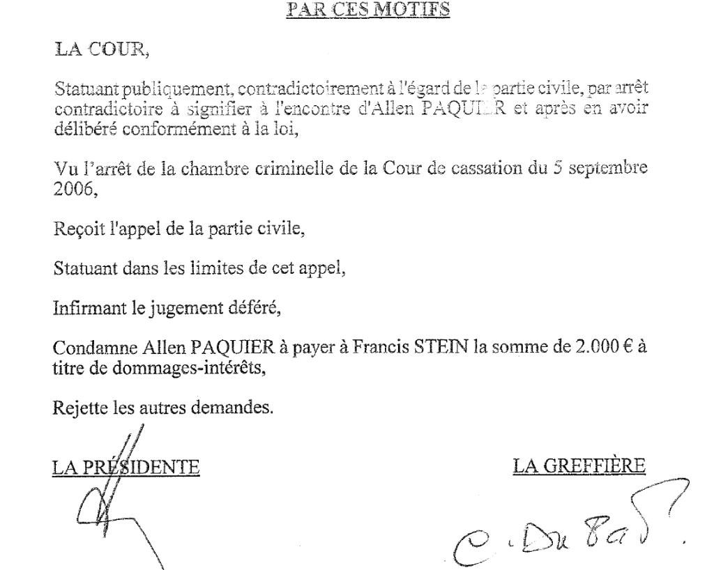 – Coupable de propos diffamatoires l’égard de Francis Stein, et l’a condamné à lui verser 2000 euros de dommages et intérêts.