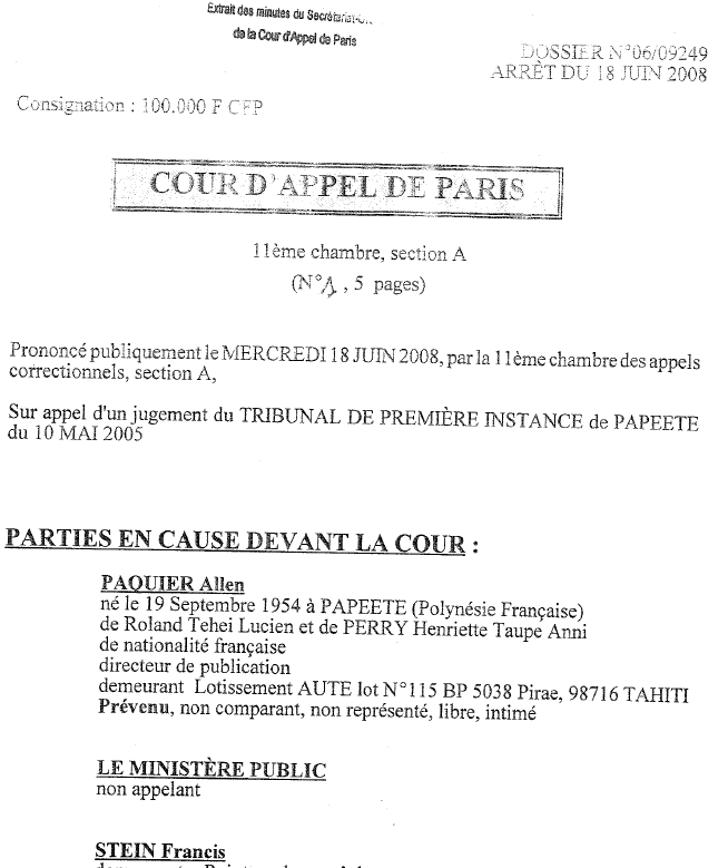 Par jugement rendu le 18 juin 2008, la Cour d’Appel de Paris statuant sur les intérêts civils a déclaré M. Allen, dit Terii PAQUIER, gérant de ce journal et directeur de la publication de la société « MAOHI Édition » :