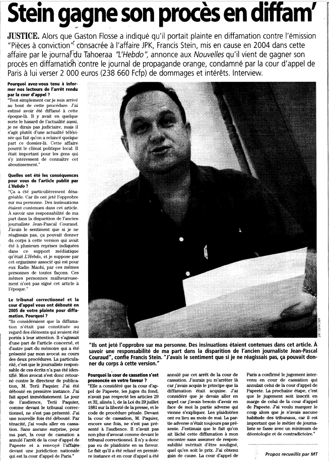 Une fois toutes les voies de droit épuisées pour évoquer cette diffamation à son endroit, Francis Stein a communiqué il y a douze ans sur ce dossier qui dû être jugé en 1ère instance au Tribunal de Papeete, puis à la Cour d’appel locale, avant qu’il ne forme un pourvoi en cassation à Paris et qu’il obtienne finalement la condamnation du gérant de la publication concernée devant la cour d’appel de Paris après quatre ans de procédures…