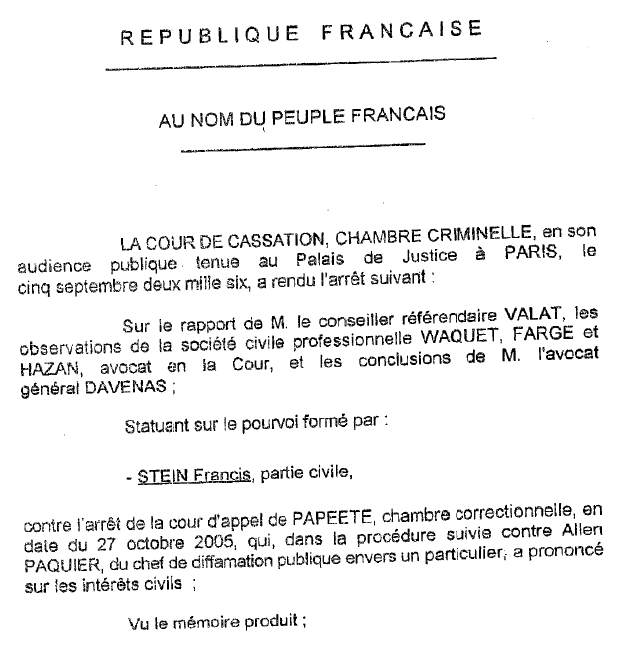 Après un jugement en 1 ère instance et un pourvoi en appel infructueux à TAHITI puisque M. Terii PAQUIER avait été relaxé sans jamais comparaître à aucune des audiences, ni constituer d’avocat – sauf devant la Cour d’appel de Papeete –Francis Stein a obtenu gain de cause dans un premier temps devant la Cour de Cassation / Chambre criminelle, réunie en audience publique, le 5 septembre 2006.
