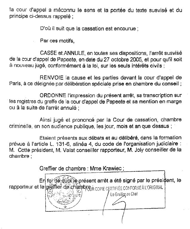 La Cour de Cassation a ainsi cassé et annulé, en toute ses dispositions, l’arrêt de la Cour d’Appel de Papeete du 27 octobre 2005, pour qu’il soit à nouveau jugé conformément à la loi, et renvoyé la cause et les parties devant la cour d’appel de Paris, désignées par délibération spéciale prise en chambre du conseil.