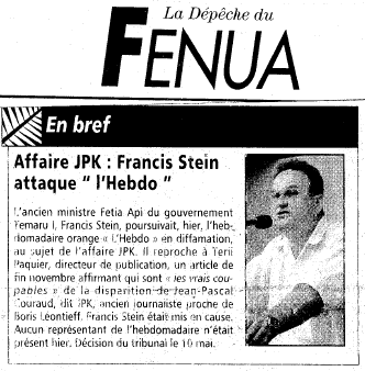 En 2004, alors qu’il faisait partie de la délégation qui rencontrait la ministre de l’Outre-mer à Paris consécutivement à la motion de censure votée grâce à un transfuge de l’UPLD ayant rejoint l’ancien parti majoritaire, un HEBDOMADAIRE politique de la place, celui-là même du parti politique ayant perdu les élections de mai 2004, a cru pouvoir le mettre en cause impunément au lendemain des révélations faites par M. Vetea GUILLOUX, et relatives à la disparition de l’ancien journaliste J P K, devenu collaborateur du Conseiller maire d’Arue, Boris LEONTIEFF, hélas lui aussi disparu avec plusieurs élus du Fetia Api.