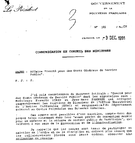 En 1991, il prend l’initiative – face au démantèlement programmé de certains services et établissement publics – de créer avec plusieurs d’entre eux un Comité pour des Etats généraux du service public [Polynésien], consécutivement à une confidence qu’il obtient d’un élu… Le président du gouvernement demande son licenciement…