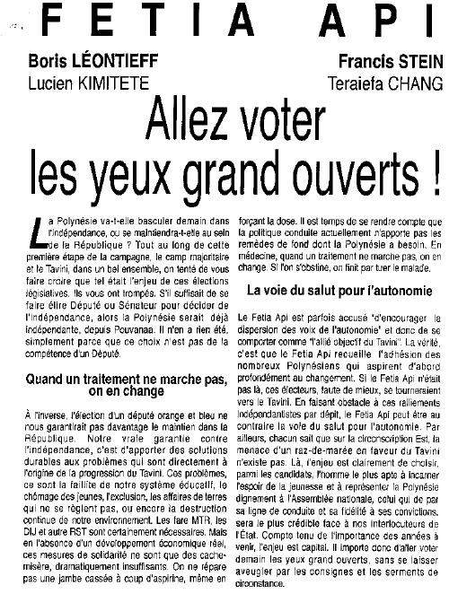 La revendication de Francis STEIN d’avoir participé à la fondation avec Boris LEONTIEFF du parti politique centriste FETIA API et d’autres colistiers qui participeront aux élections territoriales de 1996 (Philip Schyle ne figurant pas sur cette liste), donc opposé à la majorité Tahoera’a est sans équivoque .