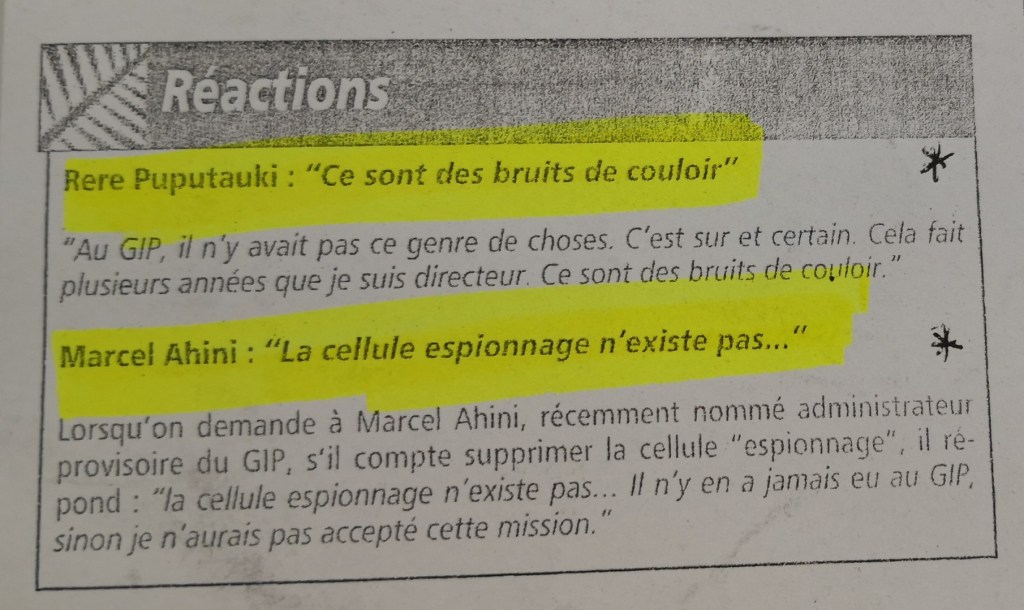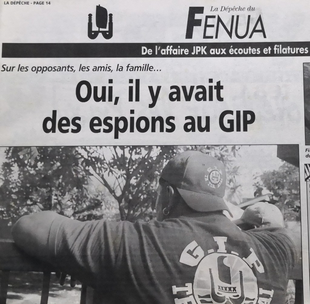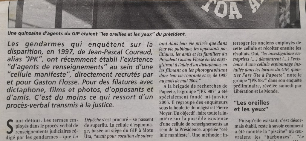 – La deuxième affaire concerne « J P K », et le Groupement d’intervention de la Polynésie ( Te Toa Arai, le G I P, « garde autorisée directement par le président de la république Jacques CHIRAC ». À l’intérieur de ce G I P fut créée une cellule occulte d’espionnage composée de « quasi-mercenaires », le « bureau du manifeste » allant jusqu’à employer 19 personnes encadrées par un ex sous-officier de la DGSE).