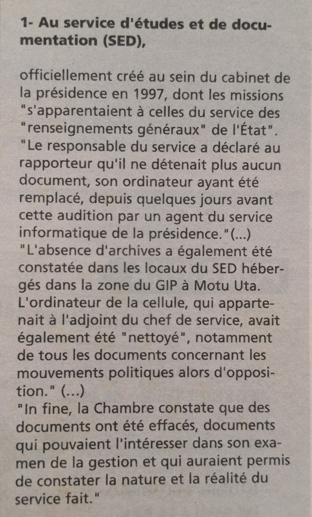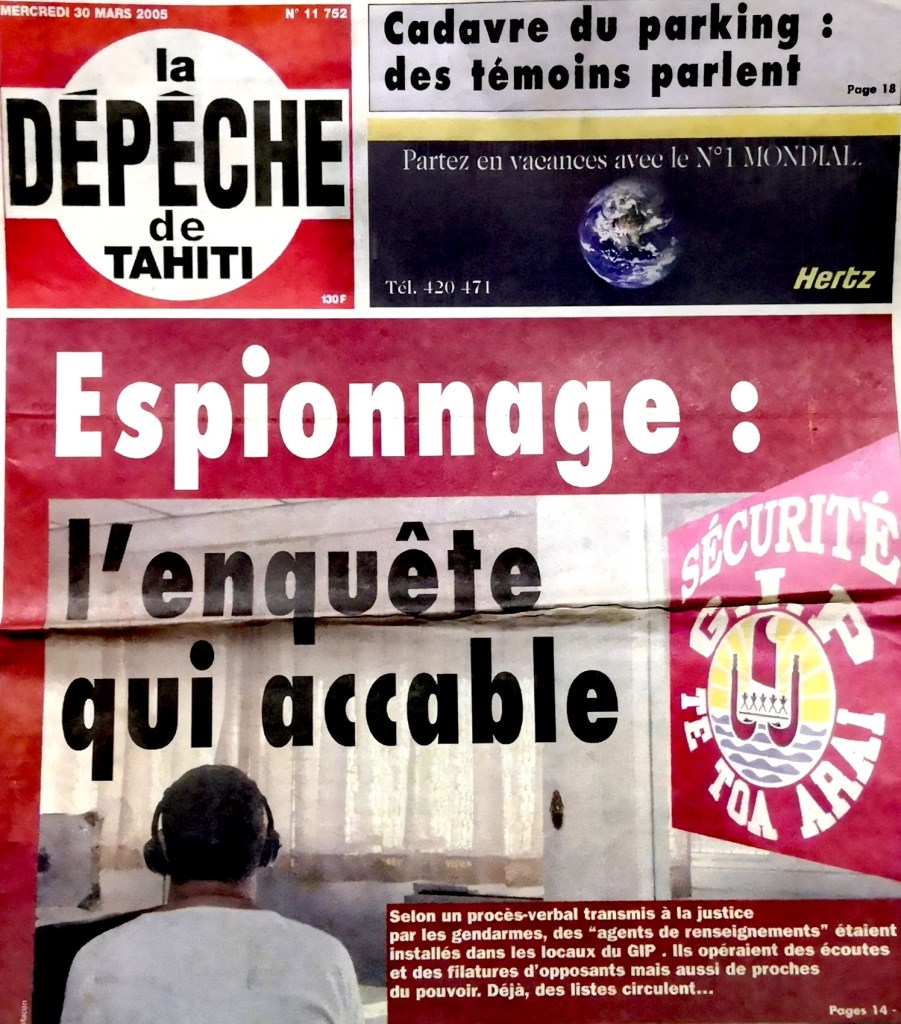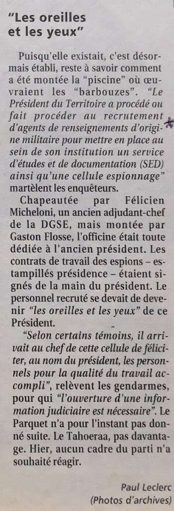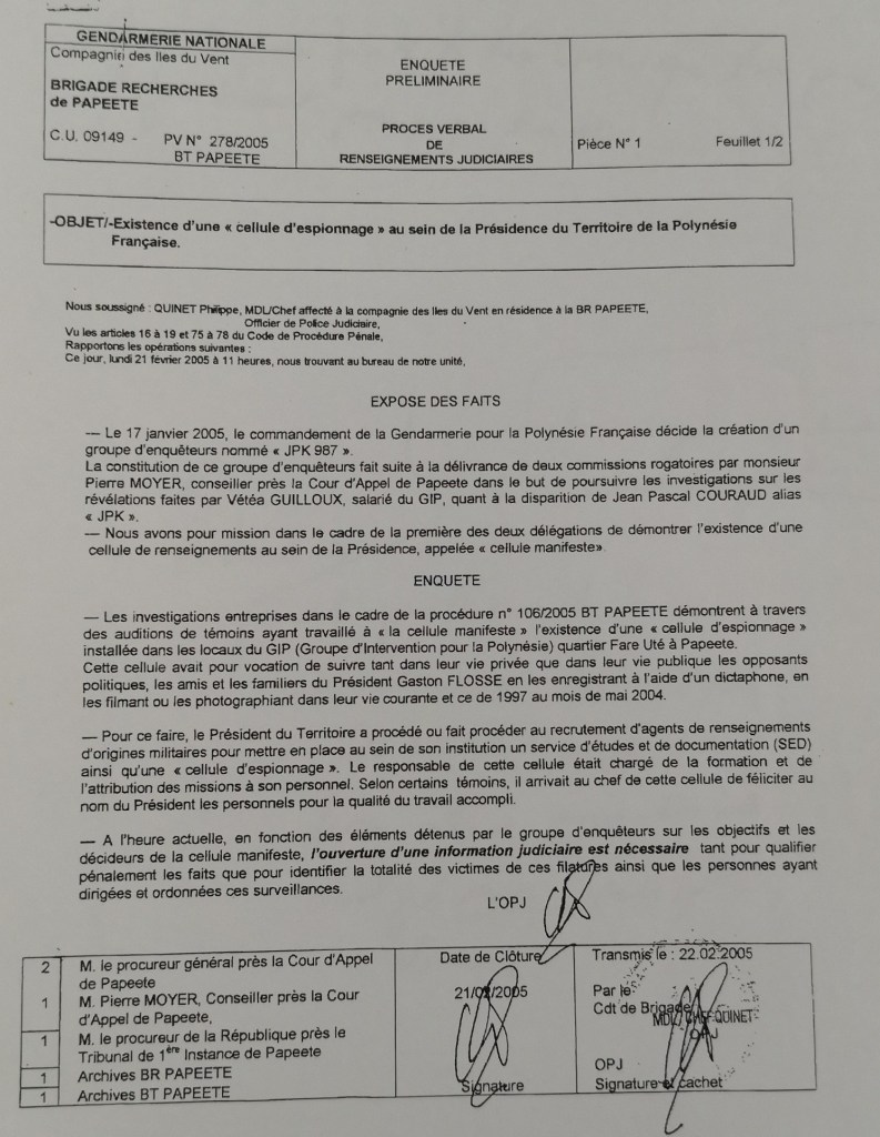 Cette cellule avait pour mission, entre autres, d’espionner Jean-Pascal COURAUD, sa femme et Francis STEIN pour le compte exclusif de Gaston Flosse, président de la Polynésie.