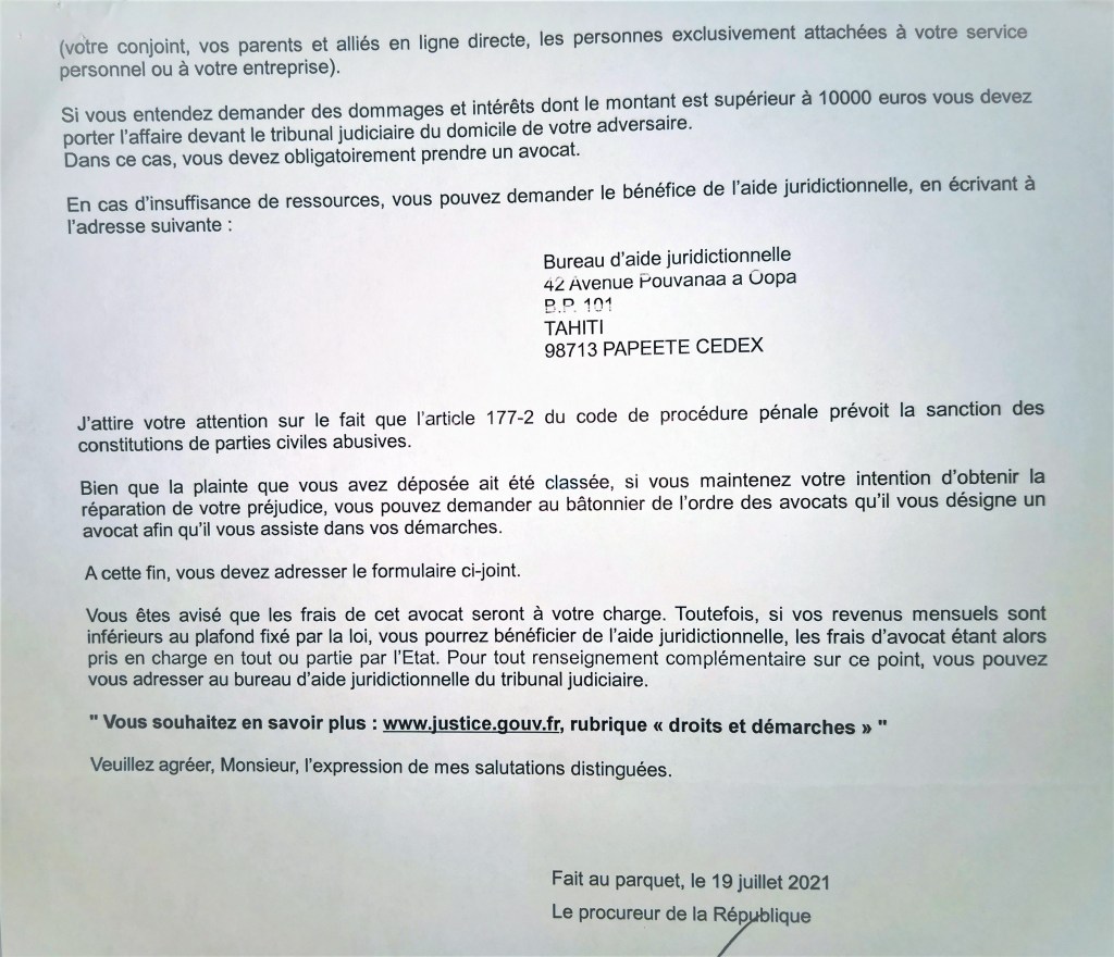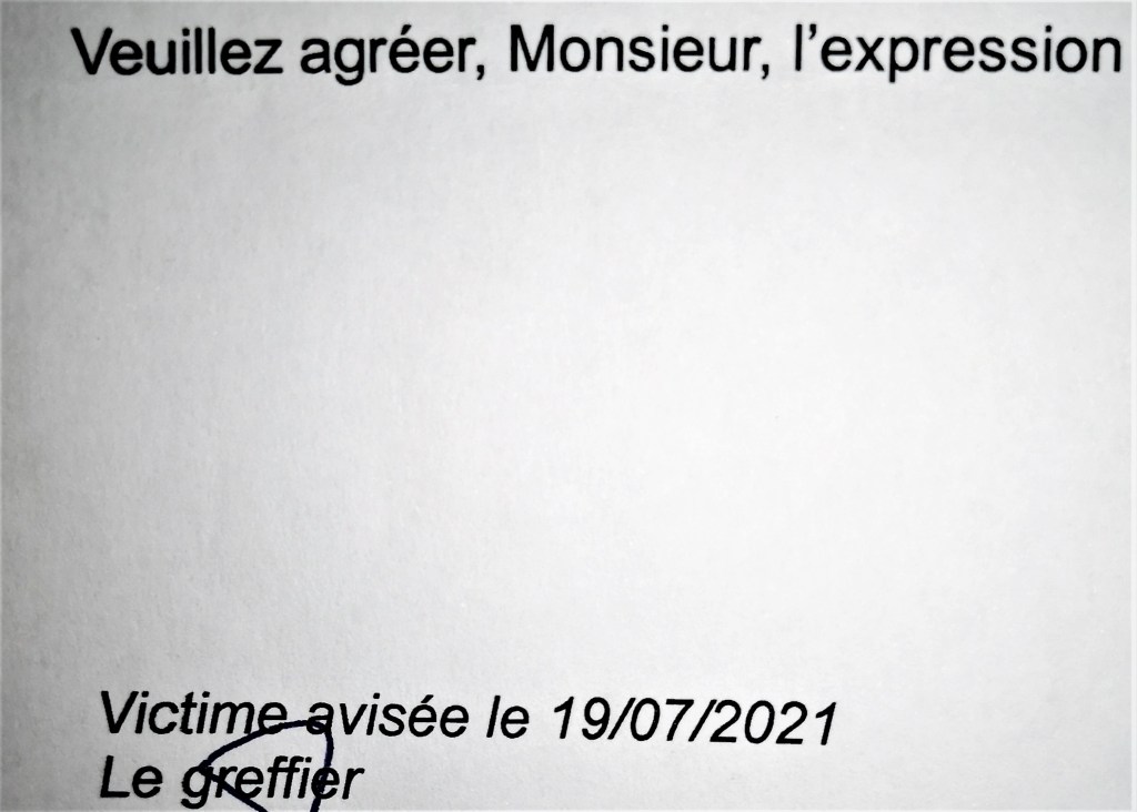 Ce qui est surprenant, c’est que ledit courrier mentionne selon le greffier, que la victime (moi-même) en a été avisée (du classement sans suite) le 19 juillet 2021, date de sa signature par le procureur et le greffier, avant l’affranchissement de l’enveloppe, huit jours plus tard, soit le 27 juillet 2021, et que cette correspondance arrive à ma boite postale début août, puisque j’ai pu en prendre connaissance le 4 août 2021.