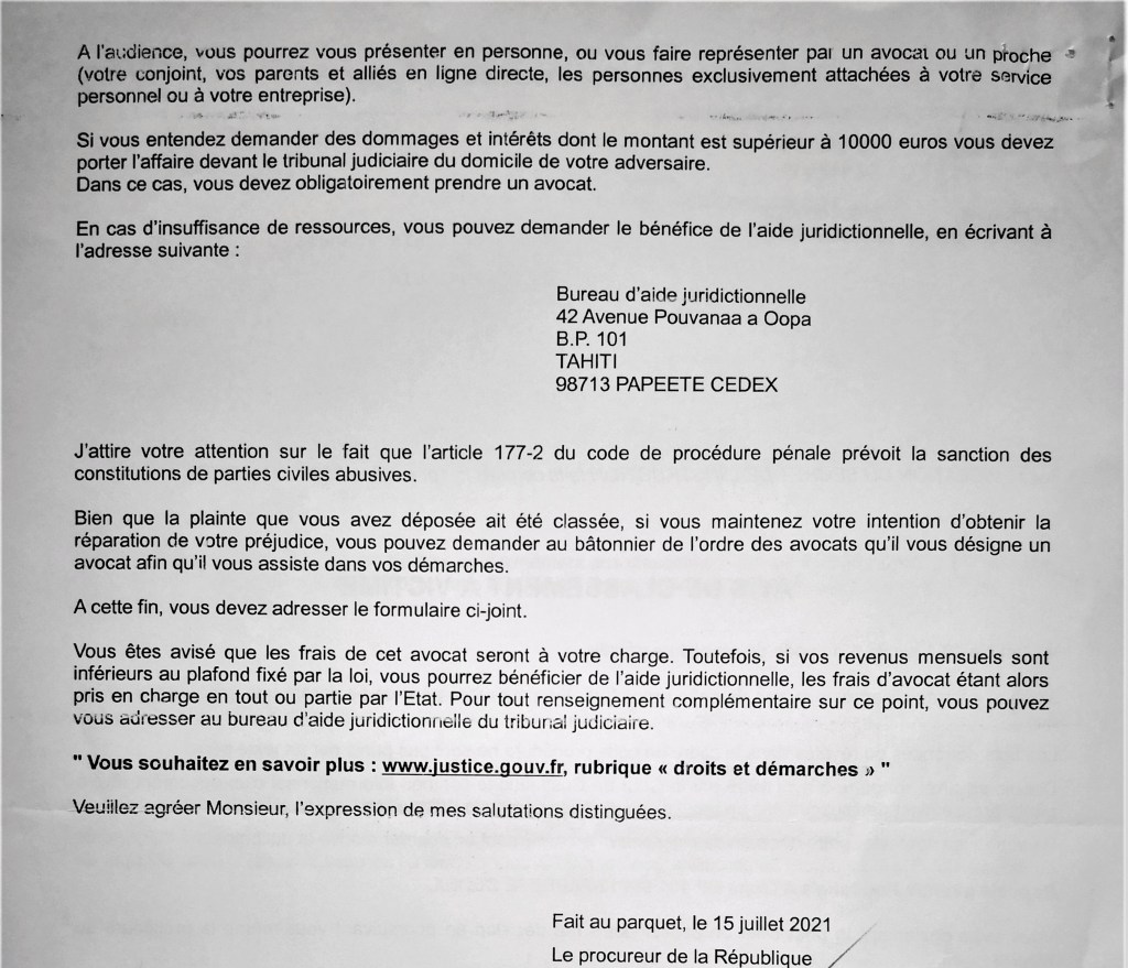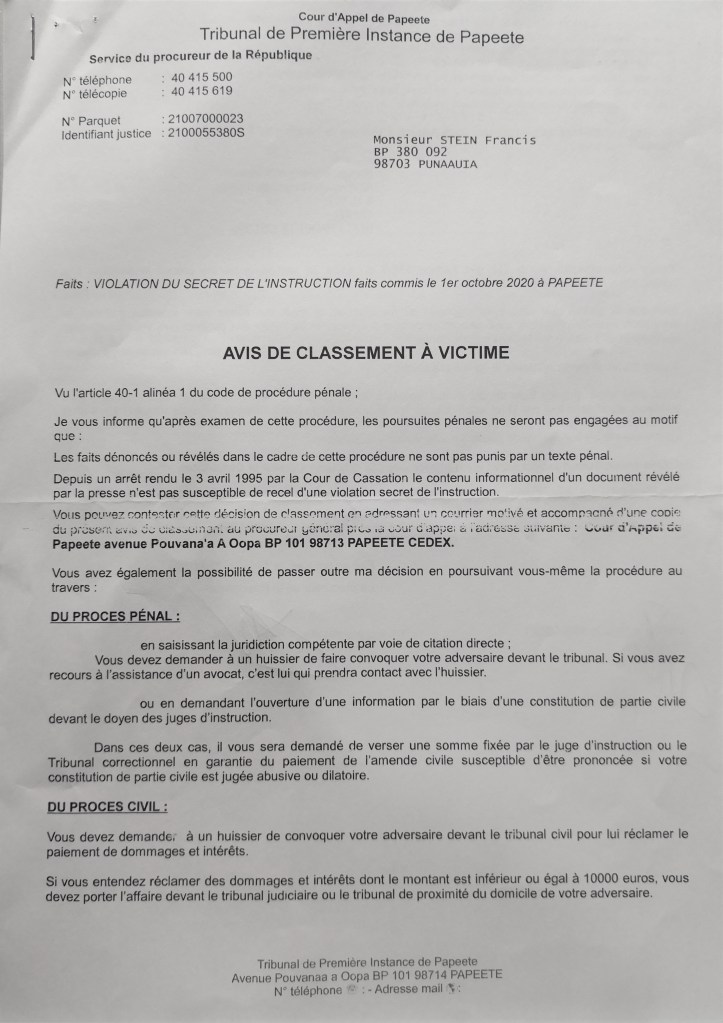 Suite à ma plainte contre « X » auprès du procureur de la République en date du 22 décembre 2020, et après avoir été auditionné par la section de recherches de la gendarmerie nationale à Papeete le 5 février 2021, pour enquête préliminaire ouverte aux chefs de violation du secret professionnel et recel de violation du secret professionnel ;