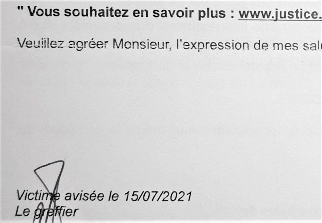 J’ai relancé le procureur de la République le 13 juillet 2021, six mois ayant passé sans que je sois avisé de la suite donnée depuis le dépôt de cette plainte.