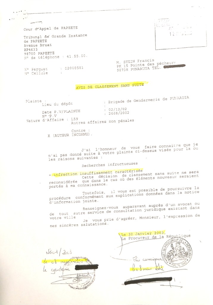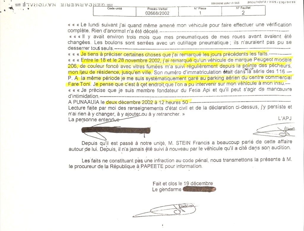 Le lundi 2 décembre 2002, après vérification du train avant, je constate avec stupéfaction que plusieurs boulons des deux roues avant sont en partie dévissés, sauf 3 sur les 10 (5 par roue) ! Je décide de porter plainte pour sabotage de mon véhicule à la gendarmerie de Punaauia. Le gendarme me délivre un récépissé de plainte. Quelques jours plus tard, le commandant de la brigade considérant qu’aucune infraction n’est réellement constituée, donne des instructions pour que je sois ré entendu dans le cadre d’une procédure de RENSEIGNEMENT JUDICIAIRE et pour que je restitue le 1er récépissé de dépôt de plainte (!) qui m’avait été délivré, qui visait la dégradation de mon véhicule. L’hypothèse d’une tentative de vol de roues me fut même suggérée !