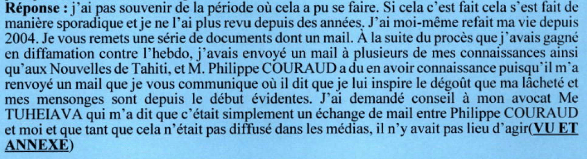 Après que J’ai consenti à m’exprimer sur demande du journaliste du MONDE Gérard DAVET en décembre 2007, article sévèrement critiqué par la partie civile qui décidément entend me voir encaisser sans réaction les accusations qu’ils lancent contre moi, de même que pour le reportage du magazine PIECES A CONVICTION en juin 2008, l’article publié dans les NOUVELLES DE TAHITI le même mois a déclenché la réaction de Philippe Couraud relatée précédemment.