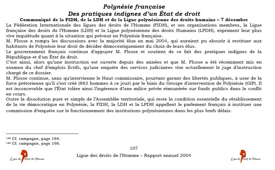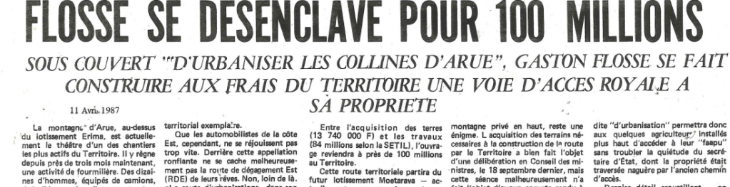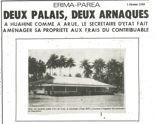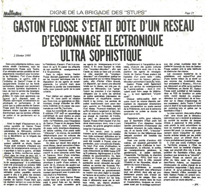 Et puis un service d’espionnage parfaitement structuré avec des agents parmi lesquels des gendarmes retraités, chargés de renseigner le président du fenua sur ses opposants, les syndicats, la presse, et même les membres de sa famille ! L’encadrement étant fourni par Paris, rémunéré par TAHITI, et issus des rang des services secrets, officier et sous officier de la DGSE en complément d’un ancien commandant du GIGN, également chargés de veiller aux tentations indépendantistes du président FLOSSE. Ce dernier qui semble à présent s’orienter par dépit vers ce créneau pourtant occupé depuis fort longtemps par le TAVINI HUIRAATIRA.