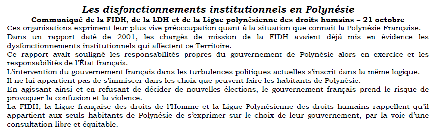 Nombre de chefs de service et directeurs d’établissement publics non polynésiens et certains issus des rangs du parti majoritaire déchu, furent démis de leurs fonctions en raison des blocages qu’ils ont participé à mettre en place au moment de l’alternance pour favoriser et accélérer le retour anti démocratique du précédent gouvernement qui les avait nommés, ce qu’ils parvinrent toutefois à accomplir.