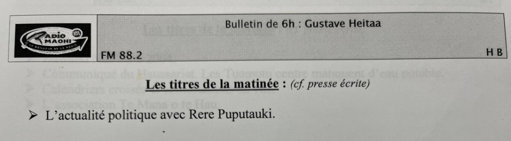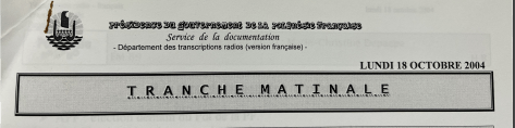 RENVERSÉ LE 9 OCTOBRE 2004 PAR LE VOTE D’UNE MOTION DE CENSURE DE L’ASSEMBLÉE, LE 1ER GOUVERNEMENT TEMARU EXPÉDIE LES AFFAIRES COURANTES ET LES MINISTRES CONTINUENT DE RECEVOIR LES TRANSCRIPTIONS DES ÉMISSIONS RADIOPHONIQUES SOUS FORME DE BULLETINS D’INFORMATIONS, DONT CELUI CI :