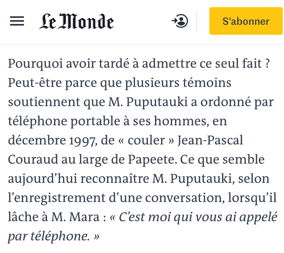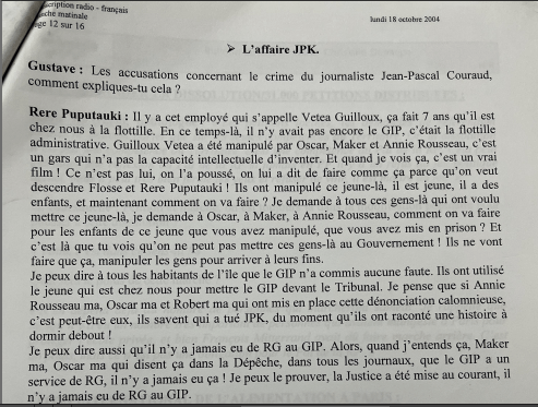 Rere Puputauki : « Il y a cet employé qui s’appelle Vetea Guilloux, ça fait 7 ans qu’il est chez nous à la flottille. En ce temps-là, il n’y avait pas encore le GIP, c’était la flottille administrative. Guilloux Vetea a été manipulé par Oscar, Maker et Annie Rousseau, c’est un gars qui n’a pas la capacité intellectuelle d’inventer.