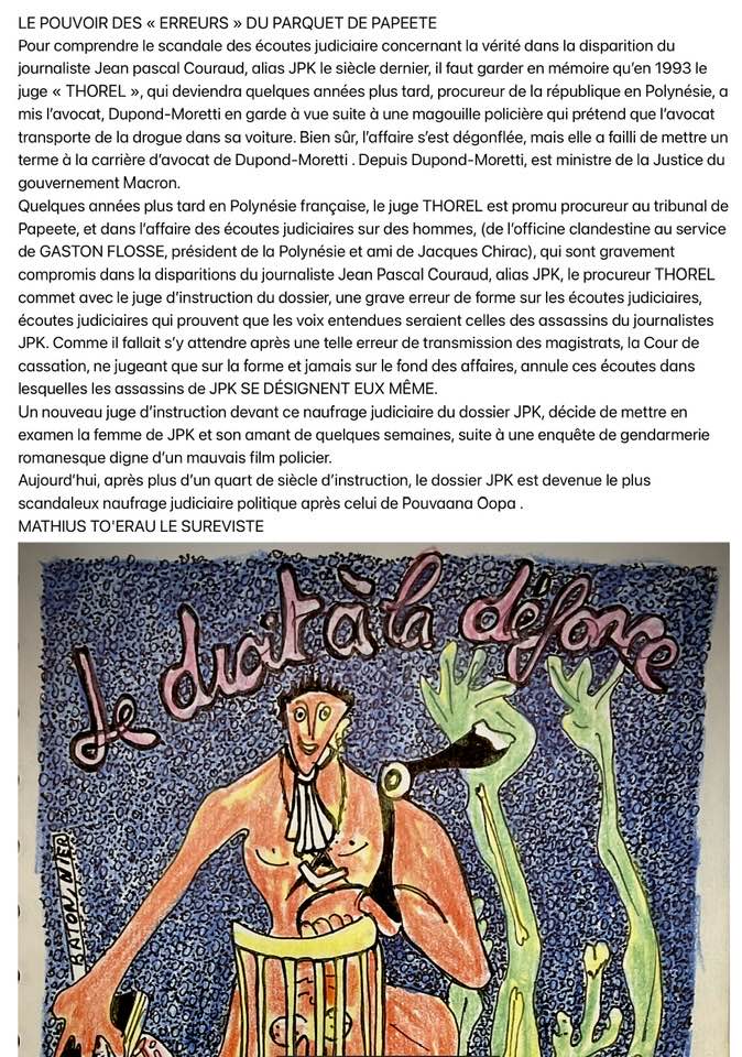 Quelques années plus tard en Polynésie française, le juge THOREL est promu procureur au tribunal de Papeete, et dans l’affaire des écoutes judiciaires sur des hommes, (de l’officine clandestine au service de GASTON FLOSSE, président de la Polynésie et ami de Jacques Chirac), qui sont gravement compromis dans la disparition du journaliste Jean Pascal Couraud, alias JPK, le procureur THOREL commet avec le juge d’instruction du dossier, une grave erreur de forme sur les écoutes judiciaires, écoutes judiciaires qui prouvent que les voix entendues seraient celles des assassins du journaliste JPK.